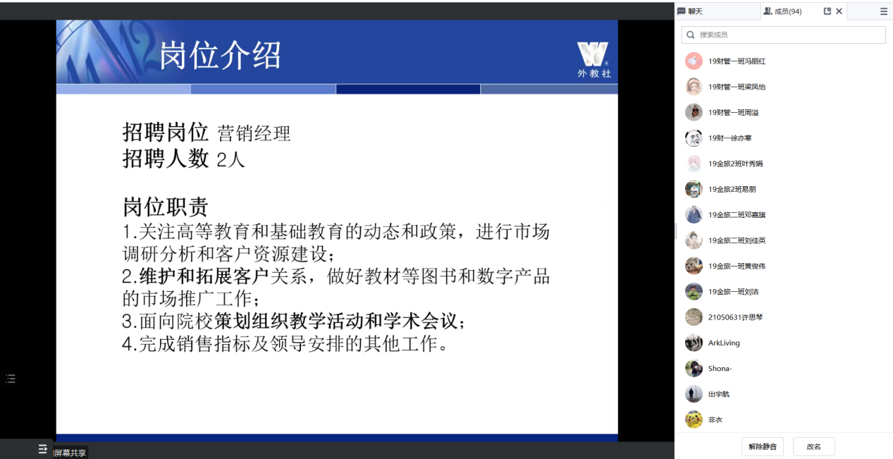 会上,用人单位通过PPT展示、线上答疑等方式向同学们介绍了公司招聘岗位需求、薪资福利待遇、岗位晋级制度等,让同学们全面了解用人单位、岗位信息及入职后个人职业发展方向。