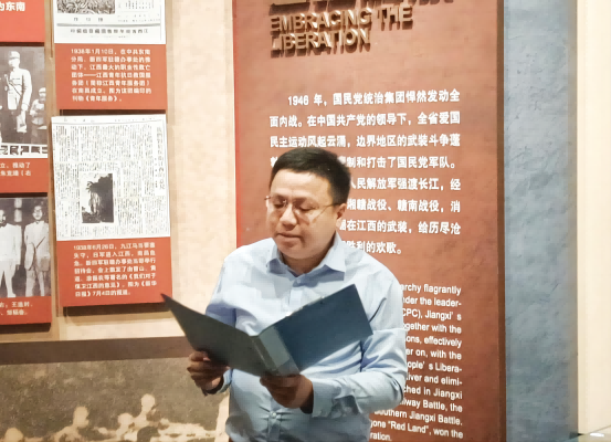 透过橱窗内陈列着一件件红军的物品,破旧的军帽、残旧的军旗、生锈的军号、磨破的草鞋......每一件展品,都生动再现了新民主主义革命时期中国共产党领导的江西人民革命斗争史,大家深深被革命先烈的英勇事迹所感动,感受到他们为国为民、为崇高理想不惧牺牲的热血和激情。