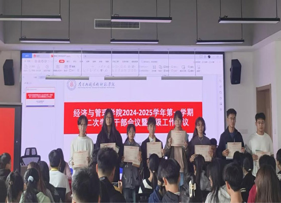 会议在庄严的国歌声中拉开序幕,学院对获奖的各班委、学生会、班级事务中心、党员服务站的“先进个人”进行了隆重的表彰。颁奖仪式上,主持人有序地邀请获奖者上台领奖并合影,现场气氛热烈非凡。最后,兰金辉老师上台发表讲话,他首先对10月份的团学活动工作,各班委的班级工作表示了肯定,其后,对接下来学院的团学活动工作提出了新的要求,并对未来工作进行了新的展望,鼓励同学们继续努力。