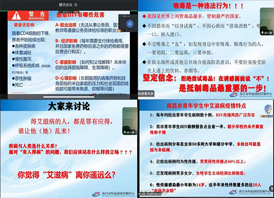 此外,班会还设置了知识问答等互动环节,学生们积极提问,辅导员们耐心解答。最后,他们也提醒学生们要珍惜生命、洁身自好,避免发生不安全性行为,切勿与他人共用注射器、剃须刀等私人物品,切勿沾染毒品,以免感染艾滋病病毒。