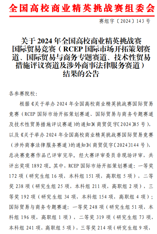 热烈祝贺我校yl23455永利官网国际商贸系学生在2024年全国高校商业精英挑战赛国际贸易竞赛中勇创佳绩! 在本次大赛中,我校学子凭借扎实深厚的专业知识和卓越非凡的实践能力,于众多强劲的参赛队伍中崭露头角,一举斩获7个奖项,其中RCEP国际市场开拓策划赛道获本科组一等奖1项、三等奖1项,专科组三等奖1项;国际贸易与商务专题赛道获本科组二等奖1项; 技术性贸易措施评议赛道获本科组二等奖2项、三等奖1项。同时,我校获最佳院校组织奖。