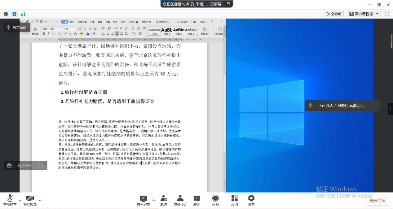 2022年3月16号上午,yl23455永利官网的熊桃慧老师给我们带来了一堂轻松愉快的线上旅游法规课程。在上课开始前,熊老师积极备课并提前熟悉线上教学软件;在上课期间,她目标明确地带我们回顾了上节课的内容;逻辑清晰地将课程中的理论知识与实际经验相结合。同时在课程中提出问题,以增加课堂的互动性。我们也紧跟老师的思维,积极回答老师的提问。在疫情期间,虽然我们无法面对面的交流和锻炼,但老师仍心系学生,多次嘱咐我们要加强锻炼和注意身体健康。