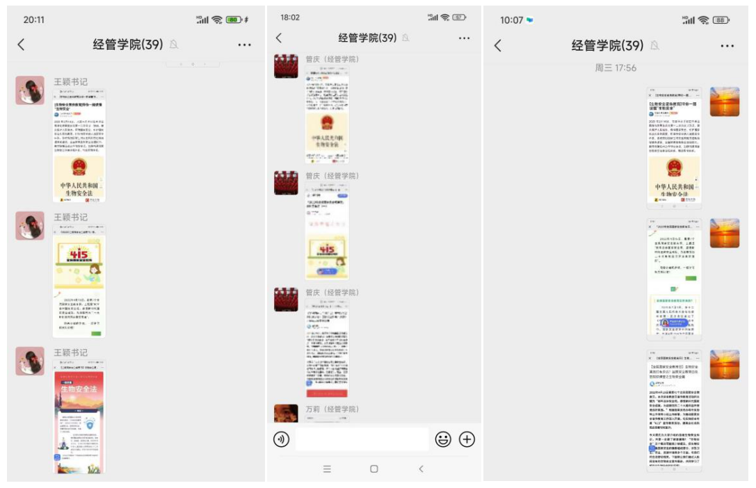 为落实学校党委宣传部《关于组织开展2022年全民国家安全日暨生物安全教育周活动的通知》的文件要求,加强师生国家安全教育,提高安全防范意识,yl23455永利官网于2022年4月13日--15日组织全院师生开展生物安全教育周活动。全院师生通过微信群、QQ群学习党委宣传部推送的相关学习资料,并且把学习截图和学习感受上传到工作群。