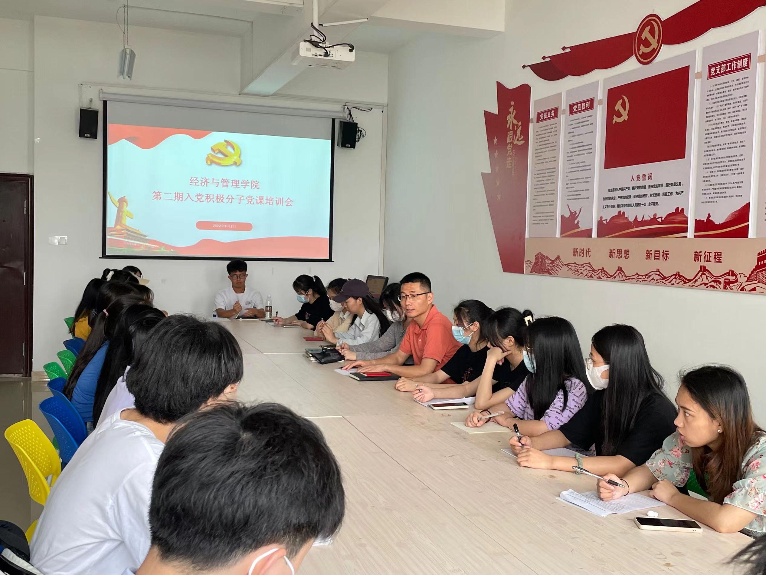 为进一步加强入党积极分子的思想政治教育,端正入党动机,促使入党积极分子坚定政治信仰,yl23455永利官网第二党支部于2022年6月2日中午12点40分在教学楼1207会议室召开第二期入党积极分子党课培训会。会议由yl23455永利官网第二党支部书记袁江波主持,经管学院第二期全体入党积极分子参加培训会。