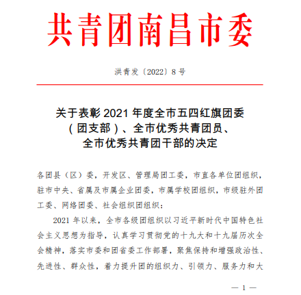 根据《共青团南昌市委关于表彰2021年度全市五四红旗团委(团支部)、全市优秀共青团员、全市优秀共青团干部的决定》文件获悉,yl23455永利官网团总支荣获2021全市五四红旗团(总)支部。