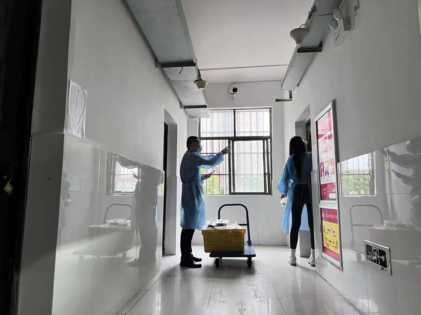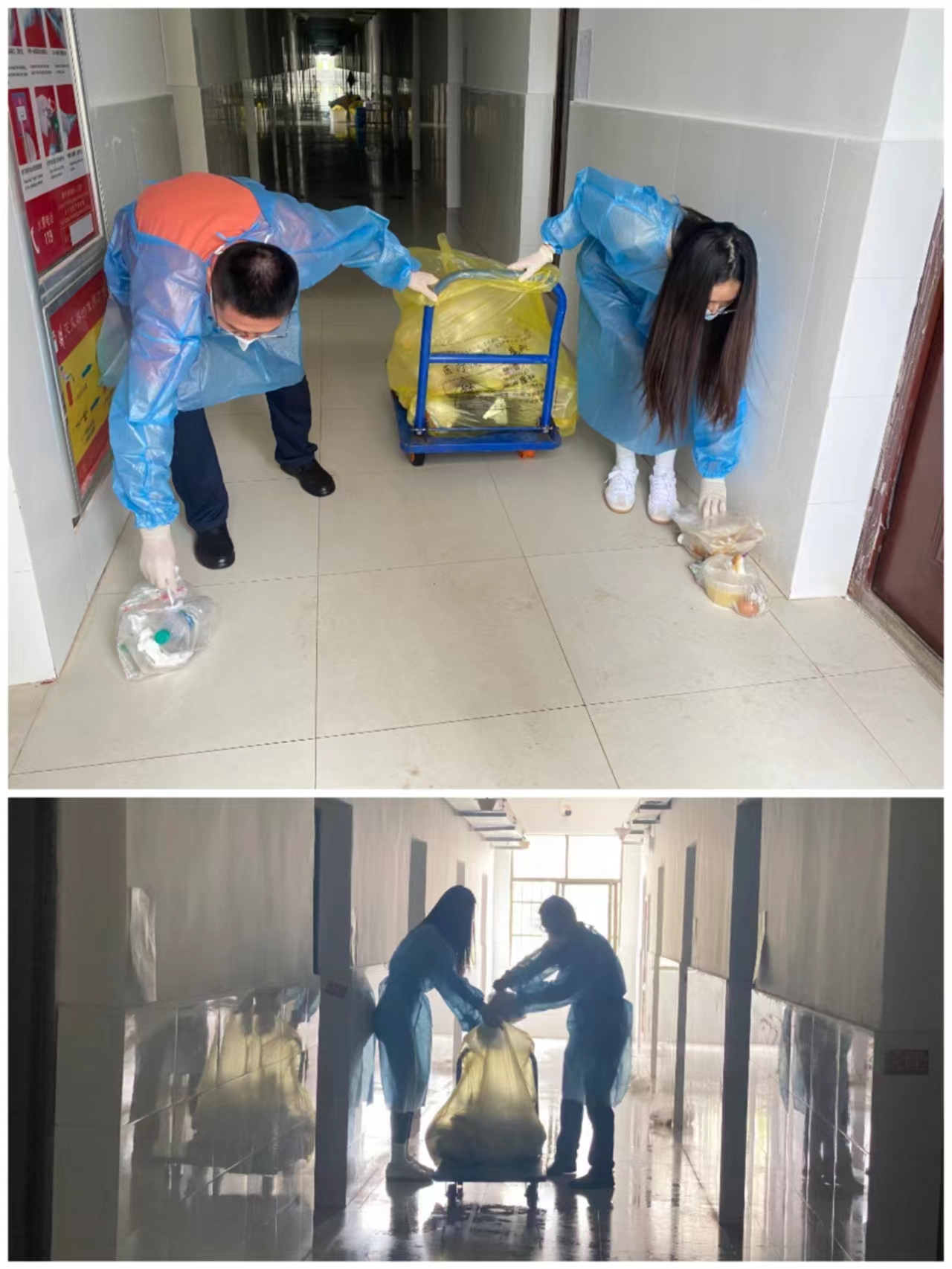 9月1日袁江波老师和李卉洁老师在学校疫情隔离点清理走廊垃圾。
